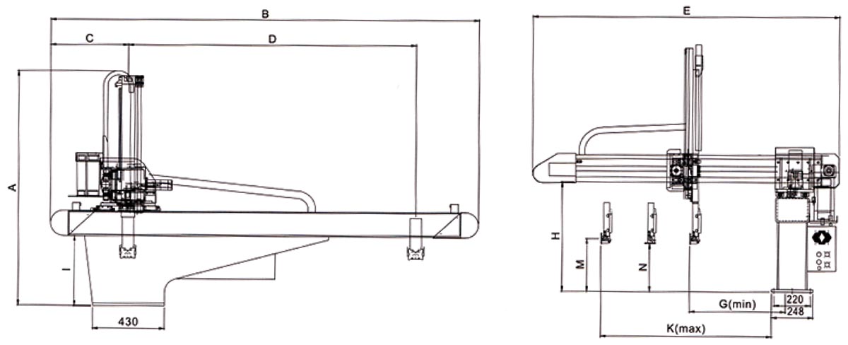 中型开放式全伺服横走机械手系列主要适用开50-280T卧式注射成型机的成品取出,均为双截式手臂,可增加伺服驱动以夹取料头,X、Y、Z、三轴采用交流伺服马达驱动,搭配台湾HIWIN低噪音滑轨,宁静而平稳,均附有标准配备。