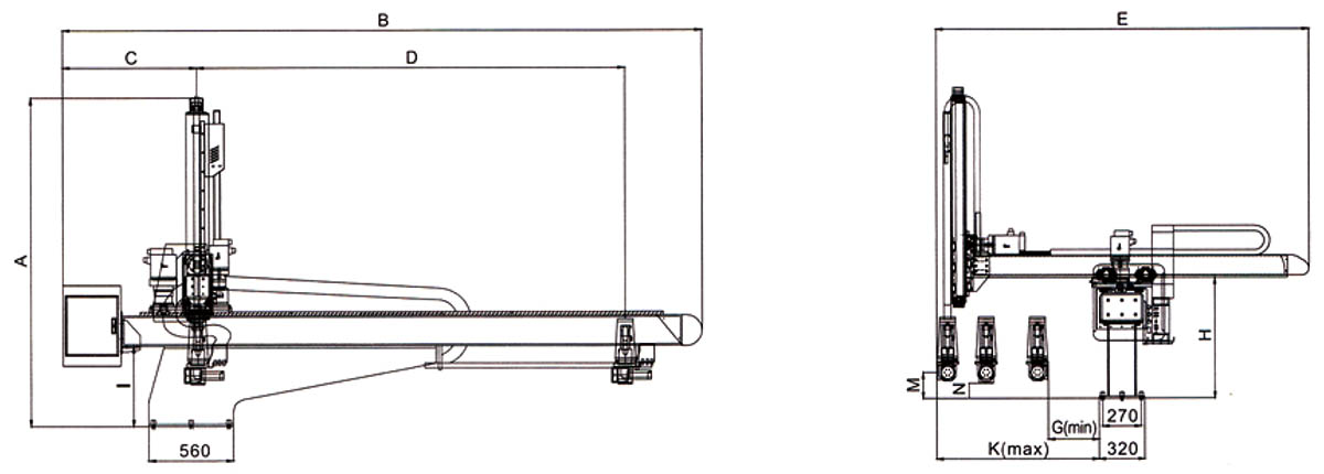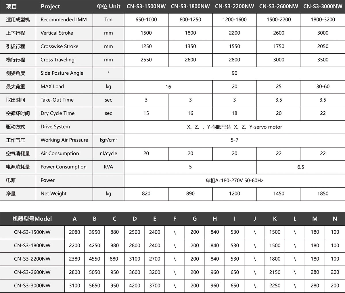 大型开放式全伺服走机械手系列主要适用于650-4000T卧式注射成型机的成品取出,均为双截式手臂,X、Y、Z、三轴采用交流伺服马达驱动,搭配台湾HIWIN低噪音滑轨,宁静而平稳,均附有标准配备。