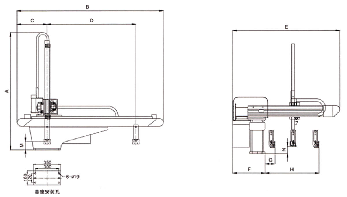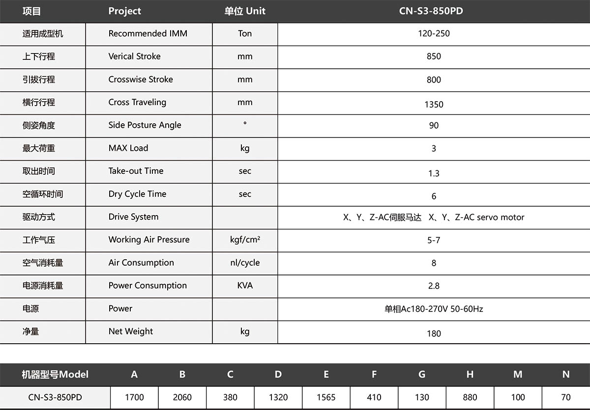 轻型伺服走机械手系列主要适用于50-280T卧式注射成型机的成品取出,均为单截式手臂, X. Y、Z、三轴采用交流伺服马达驱动,搭配台湾HIWIN低噪音滑轨,宁静而平稳,均附有标准配备。