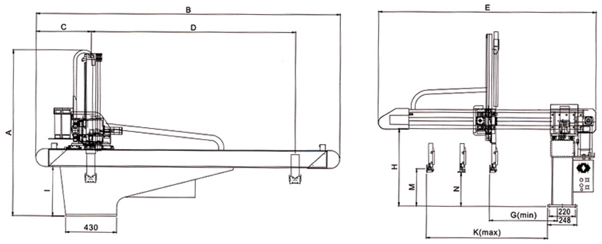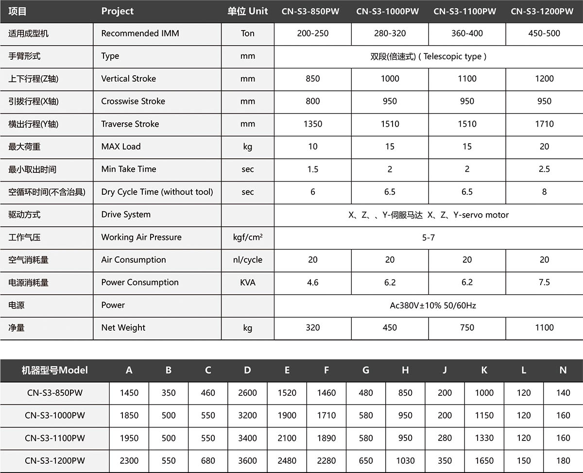 中型横走式机械手系列主要适用开50- 280T卧式注射成型机的成品取出,均为双截式手臂,可增加伺服驱动以夹取料头, X、Y、Z、三轴采用交流伺服马达驱动,搭配台湾HIWIN低噪音滑轨,宁静而平稳,均附有标准配备。